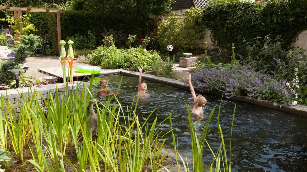 Omdat het onnodig is 200 m2 te verwarmen, is er gekozen voor een Combi Zwemvijver. Dit zijn twee vijvers die eruitzien als een geheel, maar bestaan uit een vijvergedeelte en een zwemgedeelte. Het zwemgedeelte wordt verwarmd met luchtwarmtepompen, zodat het water een aangename temperatuur heeft. De beide delen worden door middel van een vlonderdek van elkaar gescheiden, maar optisch lijkt het alsof het water eronderdoor loopt. Zo gaat er niet onnodig veel energie verloren.