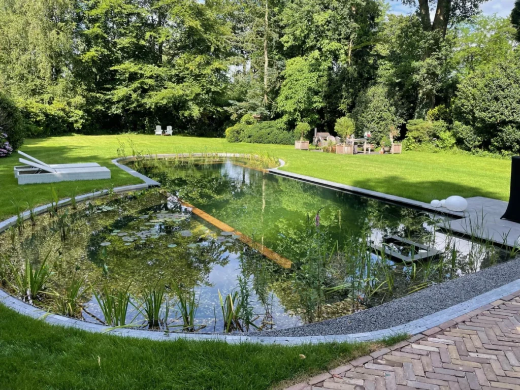 Bij dit bijzondere pand hadden we het voorrecht om een natuurzwembad aan te leggen dat perfect aansluit op de bestaande architectuur en omgeving.